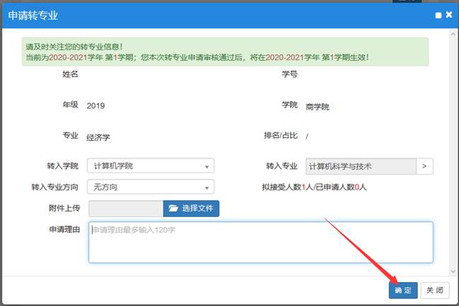 6.在申请转专业界面,输入申请理由,点击确定按钮