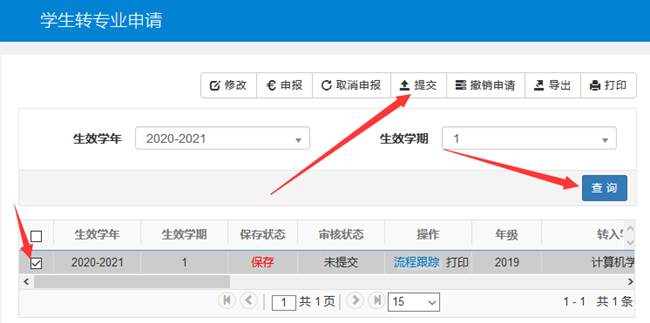 7.在学生转专业申请界面,点击查询,选中填报好的转入专业,点击提交按钮