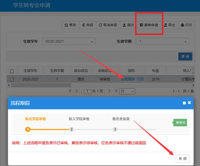 8.在学生转专业申请界面,可以点击流程跟踪链接,在弹出的界面上查看审核进度,若填报有误,在待审核状态下可以点击撤销申请按钮,撤销重新填报,一旦开始审核就不能再撤销重填了。