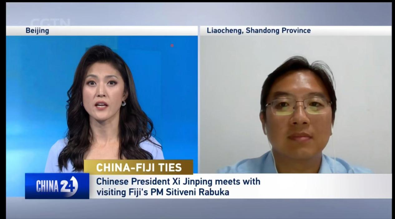 8月20日下午,国家主席习近平在北京人民大会堂会见来华正式访问的斐济总理兰布卡。当晚,我校太平洋岛国研究中心研究员倪鹏就中斐友好合作、海洋命运共同体、太平洋岛国应对气候变化研究等问题接受中国国际电视台(CGTN)晚间节目CHINA24的直播专访。 倪鹏谈到通过了解此次兰布卡访华行程,可以看出其访问重点,所到访的云南、浙江、福建等省份在扶贫及乡村振兴、新能源开发、垃圾发电、海水淡化、跨境电商等方面的成就,是斐济人民真正需要的,也是我们未来可以与岛国进行务实合作的领域。根据刚刚结束太平洋岛国暑假期间的田野调研成果,倪鹏指出斐济等太平洋岛国在应对气候变化方面迫切期待同中国加强合作,团组也深切感受到太平洋岛国人民对发展的渴望,以及中国与太平洋岛国特别是普通民众之间的深厚情谊。他认为下一步要推动中国与太平洋岛国应对气候变化合作研究不断深入,需要更深入了解太平洋岛国的国情民意和历史文化,并多维度把握当前国际学界相关研究的发展趋势。 中国与太平洋岛国合作的未来拥有巨大潜力和广阔前景。作为国内较早专注于太平洋岛国研究的科研机构,我校将继续以海洋为纽带助力构建中国同斐济等太平洋岛国海洋命运共同体,做好学科顶层设计、人才培养、社会服务等方面的工作,为提升太平洋岛国应对气候变化与海洋环境治理能力贡献力量。
