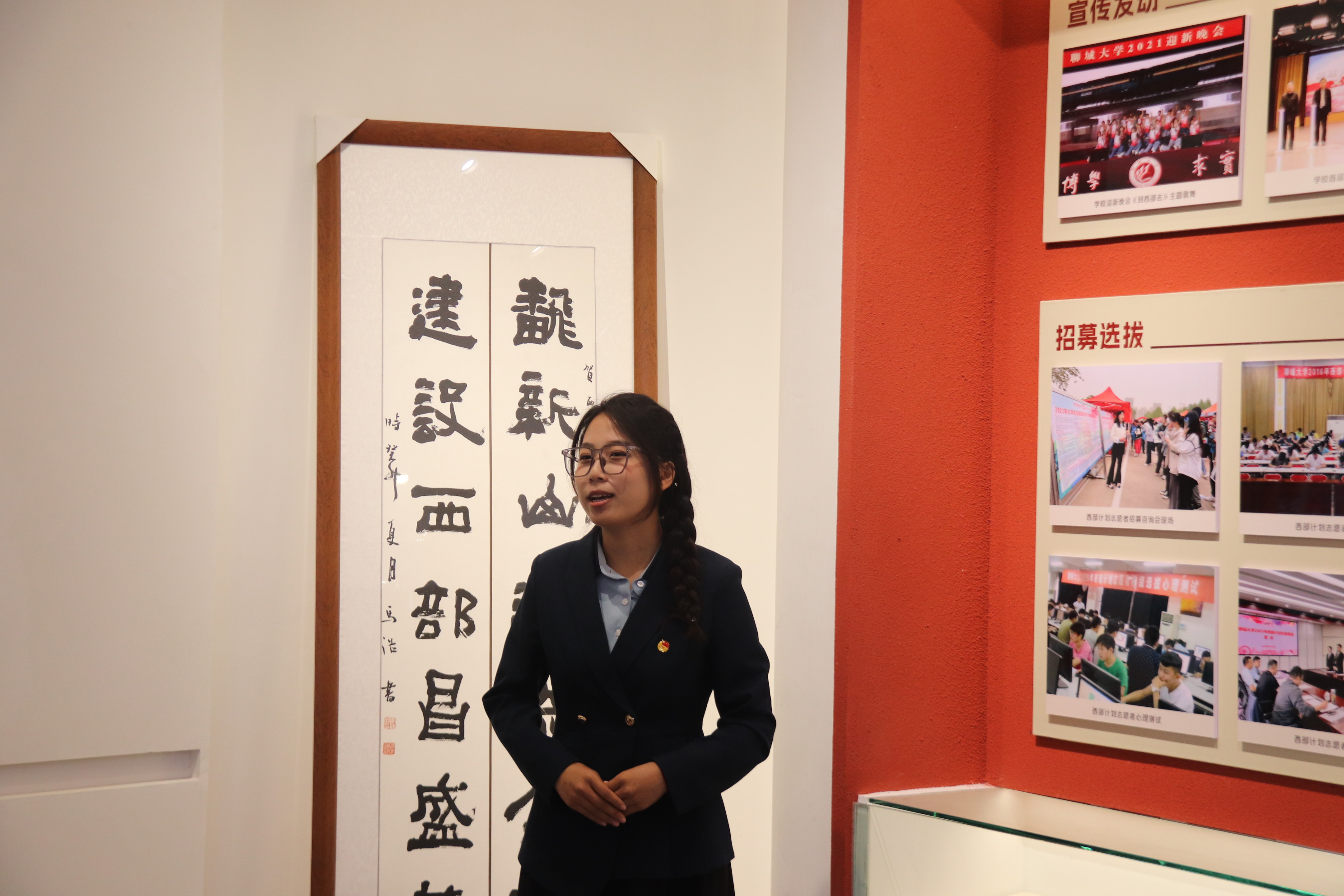 ,这一稳步向前的辉煌发展史充分展示出我校深厚的历史底蕴与教学科研成果。 讲解员带领同学们列队于各板块前,阐述我校数十年来在教学、科研、人才培养等方面取得的丰硕成果,并讲述历届校友对母校发展的鼎力支持,带领同学们感受聊大人的拼搏精神和奉献情怀。 一幅幅珍贵的历史照片、一件件充满故事的实物展品,同学们逐步了解到我校的风雨历程和辉煌成就。在讲解我校三大历史性跨越的同时,讲解员引导同学们触摸特定的实物展品,感受、品味历史瞬间。 在西部计划展览馆中,讲解员围绕西部计划五个单元展区生动讲述我校学子响应号召、投身西部的奋斗故事,将扎根西部、无私奉献的精神传递给同学们,展现出历代聊大人崇高的志愿服务精神与不怕吃苦、敢于担当的青春主旋律,激励同学们担当时代使命、投身祖国建设。 参观结束后,同学们纷纷表示,在今后的学习生活中,定以我校先辈为榜样,不断学习,踏实进取,传承聊大精神,书写精彩篇章,为我校贡献青春力量。 忆五十载奋斗路,昂首阔步正当时。本次参观活动的顺利举办,有利于加深新生对我校历史文化的认识,深化其对“西部计划”的理解,充分发挥校史育人功能,激励同学们传承良好校风,积极进取、拼搏奋斗,为我校发展增砖添瓦。