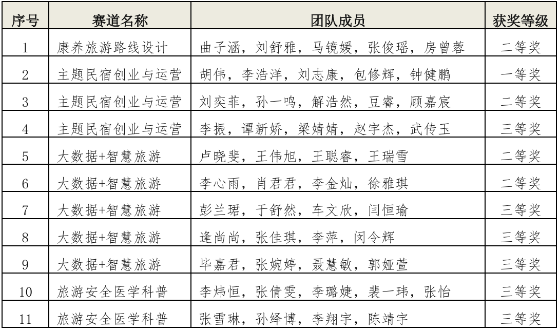 孔繁嵩、辛灵美、唐若菡、张云飞四位教师指导的参赛团队斩获一等奖1项,二等奖4项,三等奖6项,在本次参赛的四个分赛道全部获奖。 本届大赛由山东省科学技术协会、山东省教育厅、共青团山东省委、山东省发展和改革委员会、山东省工业和信息化厅、山东省人力资源和社会保障厅联合主办,山东省医学会、山东第一医科大学(山东省医学科学院)承办,决赛设置北京交通大学(威海校区)及青岛酒店管理职业技术学院两个分赛场。该赛事积极响应国家《健康中国2030规划纲要》和《山东省新旧动能转换重大工程实施规划》,致力于促进数字技术与旅游产业融合,强化应用导向,推动多业态融合发展。 获奖名单如下: 赛道规则设置上,将产业资源点与学科竞赛进行融合,有效对接产业资源推广需求。比赛分别设置:康养旅游线路设计、主题民宿创业与运营、旅游新媒体运营、研学旅游、大数据+智慧旅游、旅游安全医学科普,共六个赛道。在多条赛道比赛过程中,参赛选手通过操作主办方提供的数字化平台,参考各赛道评分体系,进行为时3小时的技术实操环节,将决赛参赛作品进行数字化处理后录入评审系统,并在接下来的比赛环节中开展项目路演及评审组专家提问答辩。 近年来随着山东省大学生互联网+康养旅游大赛的不断成长优化,在全国高校旅游管理类学科竞赛中参赛范围和影响力不断扩大。本届大赛共吸引了来自全国的1600多支高校代表队参赛,参赛学生涉及二十余个相关专业,经过初赛选出333件优秀作品进入总决赛。本届大赛小妲己直播