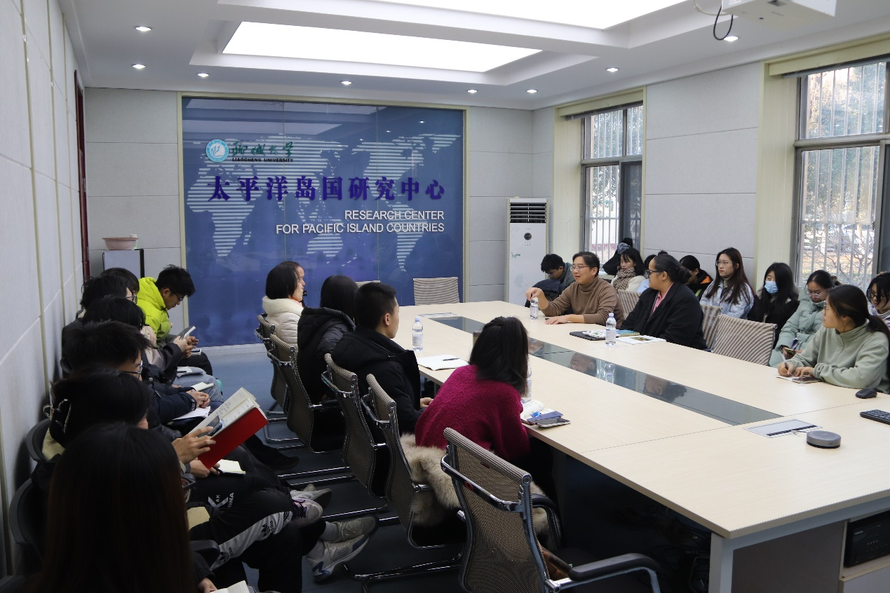 部分师生参加。 萨拉深入探讨了汤加的地理、历史与社会结构,揭示了其在气候变化与可持续发展上面临的严峻挑战。她分析了海平面上升侵蚀沿海地带、海洋酸化威胁生物多样性及渔业,以及极端天气破坏基础设施、农业和粮食安全的现状。这些变化已深刻影响汤加经济、引发人口迁移,并造成社会文化心理障碍。萨拉强调国际社会,特别是联合国气候变化框架公约(UNFCCC)的设立,在支持汤加应对气候变化、维护国家主权和公民身份完整性中发挥了重要作用。她进一步提出缓解与适应气候变化的措施,为应对汤加气候危机提供了建设性建议。 本次活动使同学们了解到汤加在应对气候变化和实现可持续发展过程中所面临的挑战与机遇,深化了对区域问题的理解,进一步推动了太平洋岛国研究中心在气候变化与可持续发展领域的学术研究与国际合作。