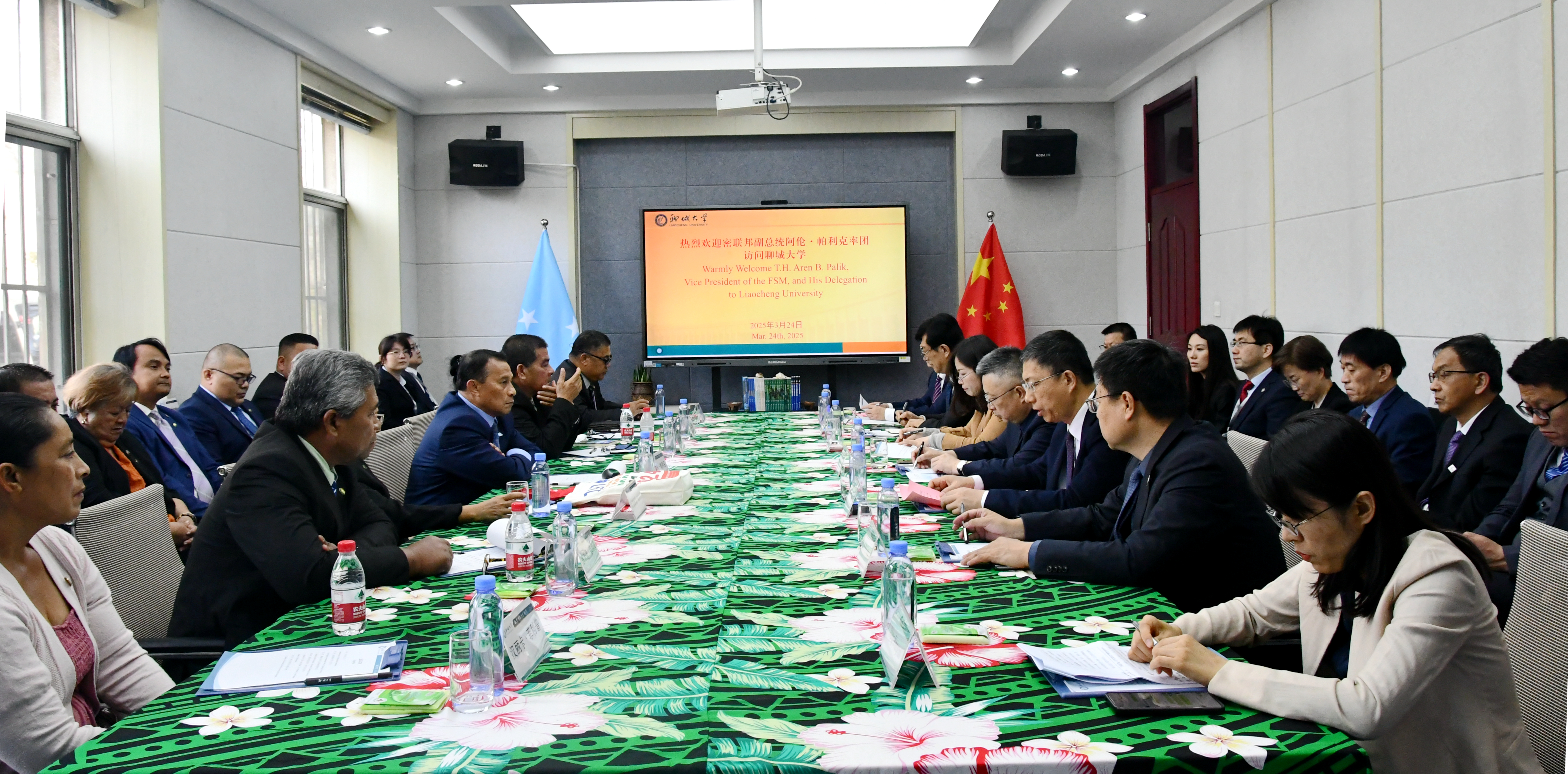 3月24日,密联邦副总统阿伦•帕利克及夫人阿德丽塔•帕利克,科斯雷州长图伦萨•帕利克及夫人玛丽•帕利克,科斯雷州议长塞米恩•菲利普及夫人汉丽卡•菲利普等一行14人来校参访。中国政府太平洋岛国事务特使钱波,山东省外办副主任、一级巡视员李永森等陪同参访,聊城市委秘书长王刚,我校党委副书记、校长白成林,党委副书记、校务委员会副主任、中国—太平洋岛国应对气候变化合作中心主任房增福等接待了客人。 来宾参观了中国—太平洋岛国应对气候变化合作中心、小妲己直播
