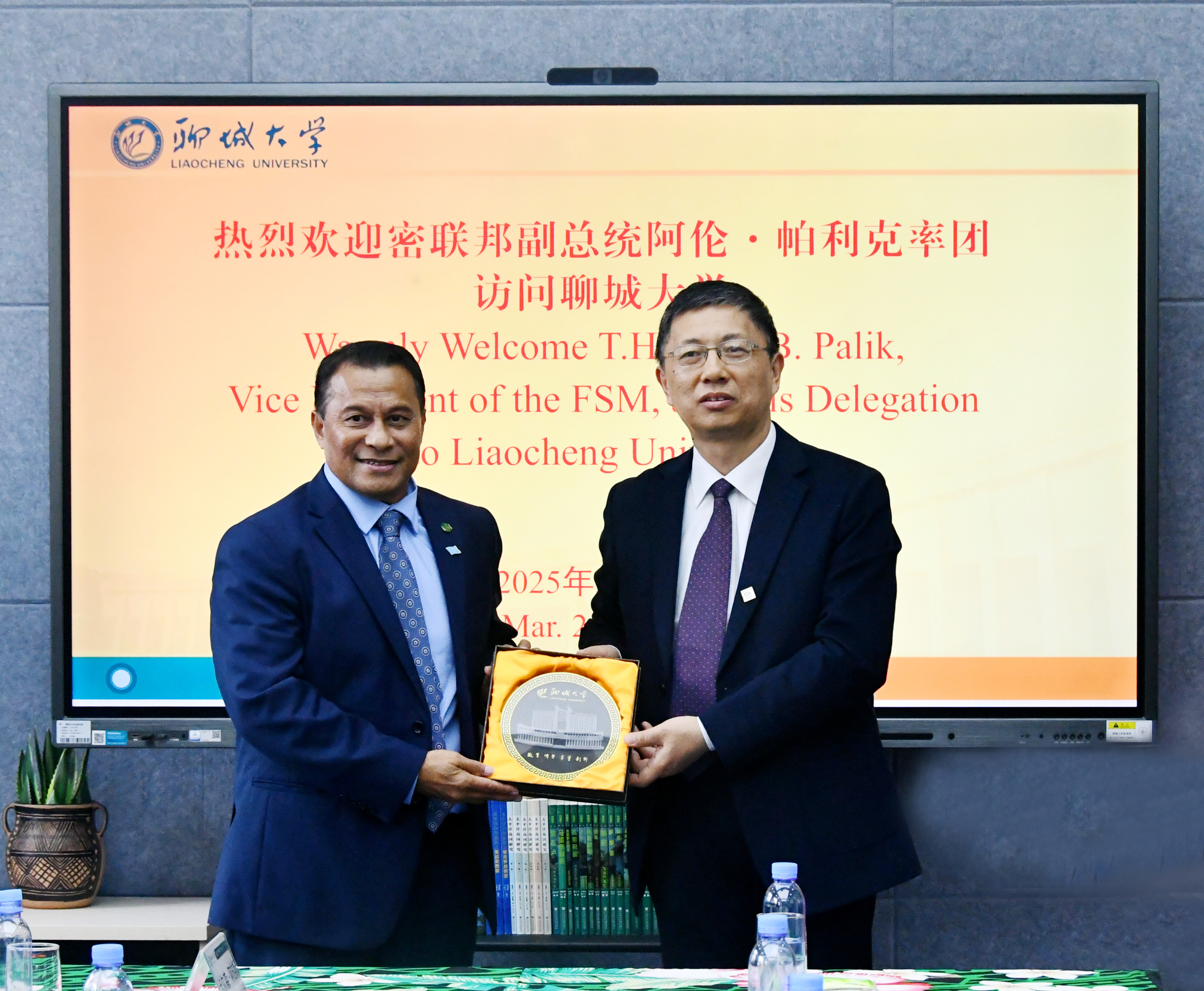 对岛国开展全面研究,取得丰硕成果,在应对气候变化等领域的研究成果更是起到了学术引领作用。中国—太平洋岛国应对气候变化合作中心开展的培训、人文交流等系列活动不仅为岛国人民带来了福音,而且对全球治理提供了借鉴。他表示,中密之间的友谊和纽带是经得起考验的,双方开展的系列合作,为日后拓展合作广度和深度打下良好基础。他希望双方能在留学生培养和教育培训等方面开展更广泛和更深入的合作,共同在应对气候变化和区域经济社会发展中做出更大贡献。 白成林还向阿伦•帕利克赠送了刻有聊大校训的艺术炭雕盘、建校50周年纪念T恤及太平洋岛国研究丛书等纪念品。 来源:党委宣传部