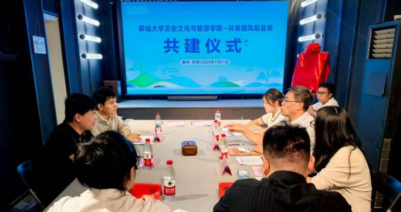 宣传片后,金帅代表共青团凤阳县委对聊大师生一行表示热烈欢迎。他强调,共建社会实践基地是凝聚青年力量、服务区域发展大局的重要战略支点,希望双方以活化地域文化基因、升级志愿服务能级为关键抓手,将聊大的学科优势深度融入凤阳“人才强县”战略,让高校智慧与地方发展同频共振,实现互利共赢的良好局面。 卢庆洪回顾学院“经世致用”的实践育人传统,高度评价此次共建的里程碑意义。卢庆洪表示,学院将以实践基地为纽带,充分发挥历史文化研究、旅游管理规划等专业优势,深化资源共享与优势互补,推动育人链与需求链精准对接,引导学生在火热的社会课堂中“受教育、长才干、作贡献”,助力地方在深度合作中激发内生动力、提升发展质效,最终实现“高校智慧赋能地方振兴,地方沃土反哺育人成才”的良性循环与共生共荣。 凤阳县青年志愿者协会负责人荣超凡与小妲己直播