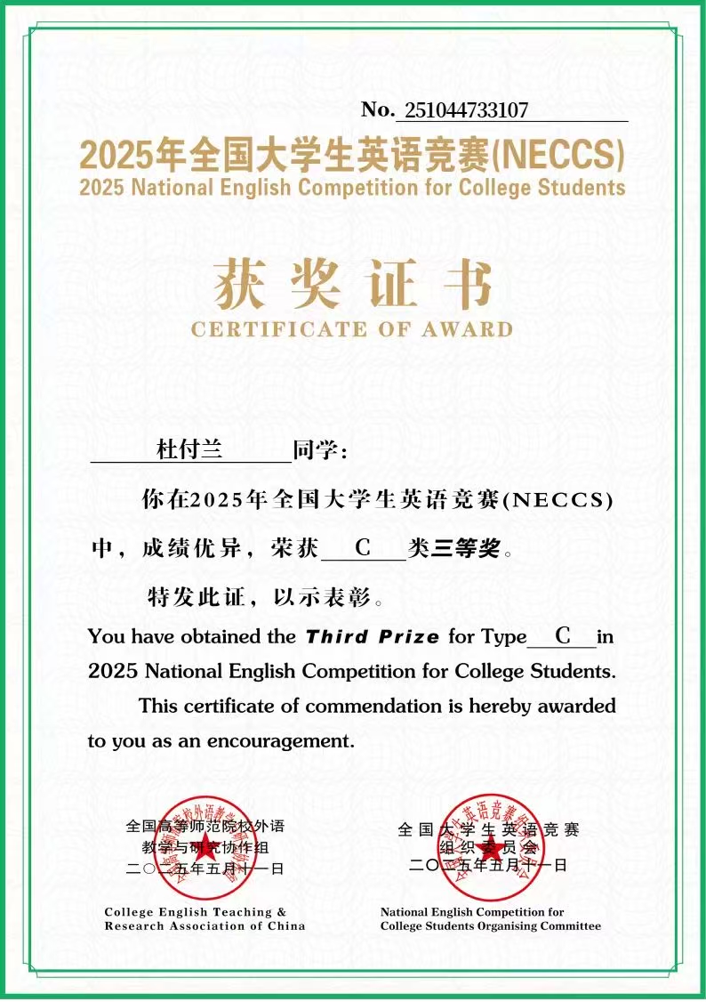 小妲己直播 学生在2025年全国大学生英语竞赛中荣获C类三等奖
