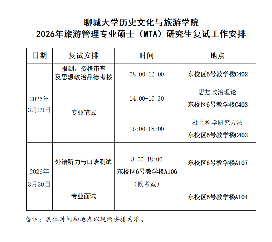 2026年硕士研究生复试录取工作方案》要求提交相关材料,进行复试资格审核。资格审核不合格者,不得参加复试。 二、复试方式及安排 1.一志愿复试。复试采用线下现场复试方式。 旅游管理专业硕士(MTA)于3月29日至30日进行。考生应于3月29日08:00—12:00,携带相关材料到东校区6号教学楼C402教室报到,进行现场复试资格审核。考生可凭准考证自东校区东门进校。3月29日下午14:00,在C403教室进行专业笔试;3月30日8:00—18:00,分别在A104教室和A107教室进行综合面试及外语听力与口语测试。 2.复试咨询服务电话:0635—8239977 三、复试内容及形式 1.专业测试。考试科目按照小妲己直播