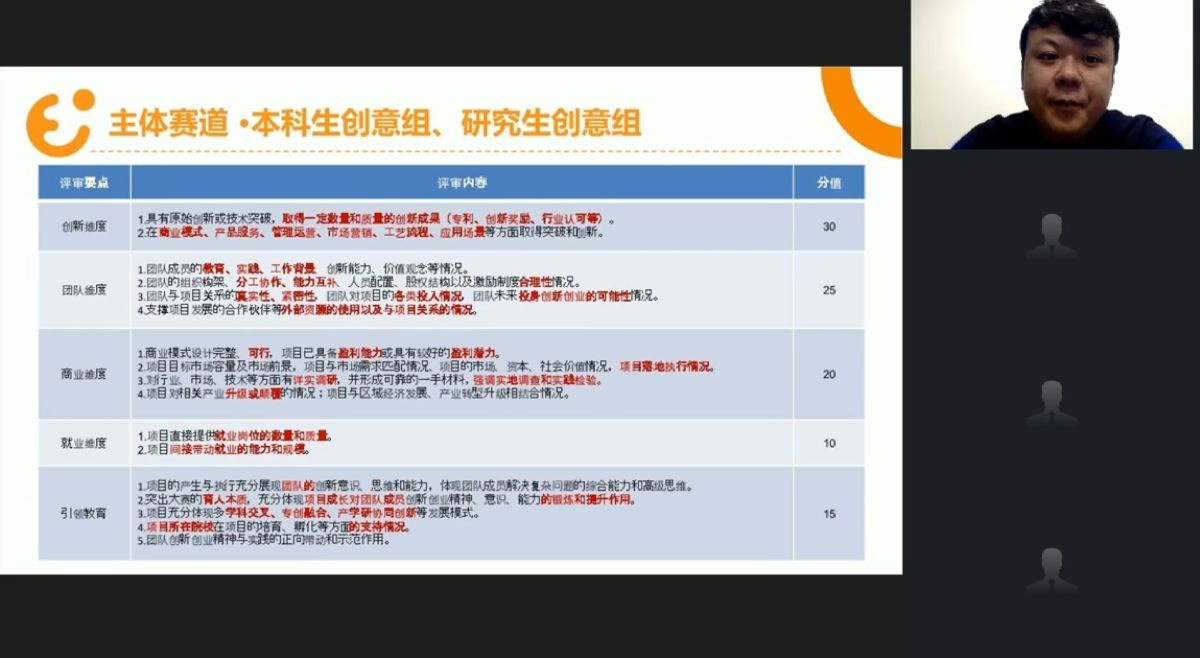 “云上”指导系列讲座,为我院学生做“精益创业思维在创赛中的运用”专题报告。 报告中,张国珩老师围绕各类创新大赛的赛道选择、团队组建及建设和后续发展三方面进行讲解,就参赛技巧和大赛细节与同学们展开深入交流。张老师通过三幅柱状图,非常直观地分析了2015年至2020年的参赛情况,阐释了“大赛金奖项目由‘千里挑一’到‘万里挑一’”的演变过程。面对当前大赛严峻的竞争形势,张老师从专业视角出发,提出“升维思考,降维打击”的指导策略,引导同学们懂得如何去思考和分析。 随后,张老师为同学们详细讲解了“高教主赛道”、“红旅赛道”和“职教赛道”三个大赛主赛道。张老师指出,主体赛道的评审要点包括创新维度、团队维度、商业维度、就业维度和引领教育五个方面,同学们要着重注意各个评审要点的完善。为充分发挥专业优势,张老师建议,本学院的同学们应尽量侧重于“互联网+”文化创意服务、“互联网+”公益服务等项目类型,做到专业对口。在当前参赛环境极度不稳定的条件下,为让同学们少走弯路,张老师向同学们提出“精益创业心法”,并从客户验证、小步试错、高速迭代三方面对此方法进行解读。最后,就同学们在参赛中经常出现的同理心较差、竞品不足等问题,张老师向同学们详细分析其他高校优秀的创新创业项目,以此来帮助同学们寻找灵感,防范在备赛过程中可能会遇到的种种问题。 本次活动的顺利举办,不仅有利于大学生创新创业工作的推进,增加同学们对创新创业、学科竞赛与挑战杯等大赛内容的了解,而且有益于进一步鼓励同学们自主创新创业,营造学院良好的创新创业氛围。(通讯员 王晓婉)