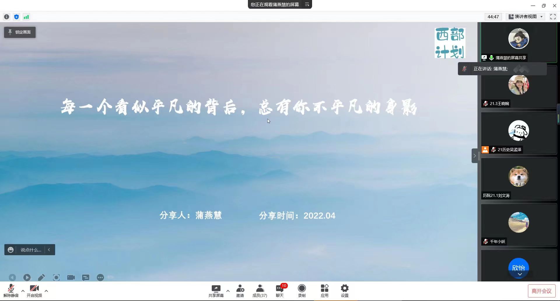 怀满腔才华,赴青春之行。4月15日,为响应国家号召,帮助同学们深入了解西部计划的有关政策,学院邀请现服务于宜宾市翠屏区人民政府西郊街道办事处党群办的蒲燕慧,通过线上的方式,就西部计划的相关问题为大家进行详解。 “错过报名时间还可以报名吗”“地方项目和国家项目有什么区别”“西部计划有什么优惠政策吗”,面对同学们的提问,蒲燕慧一一解答,十分详尽。在解答过程中,蒲燕慧结合当下网络热词,使原本枯燥无味的宣讲变得生动有趣。蒲燕慧提及自己参与西部计划的经历,她向同学们分享道:“西部计划对于我来说,不仅是一段支教的经历,更是使我坚定人生方向的一把船桨,它让我认清自己的真实想法,我想我愿意为国家建设事业奋斗终生!”宣讲最后,蒲燕慧为同学们提出了四点忠告:想清楚自己是来干什么的、了解自己的不足、学习很重要以及不要有落差感。她鼓励同学们积极加入到西部计划中,服务西部,坚守本心,为自己的青春梦、也为中华民族的伟大复兴中国梦贡献出自己的力量。 “到西部去、到基层去、到祖国最需要的地方去”,小妲己直播
